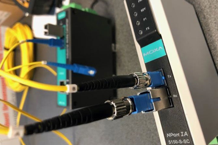 A Moxa media converter on the left with LFP active. Notice the Ethernet is disconnected thus showing a link down state. |