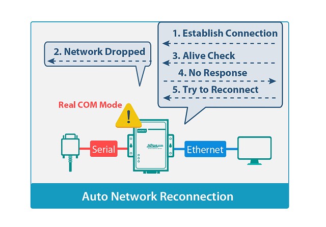 The advanced auto network reconnection function embedded in the Real COM driver ensures your CNC machines stay connected with your Ethernet-based systems. If the TCP connection drops, and our NPort serial device servers do not respond to the Alive Check packets, the Real COM driver will repeatedly try to reestablish the TCP connection so that you don’t need to close the port and reopen your software to reconnect.