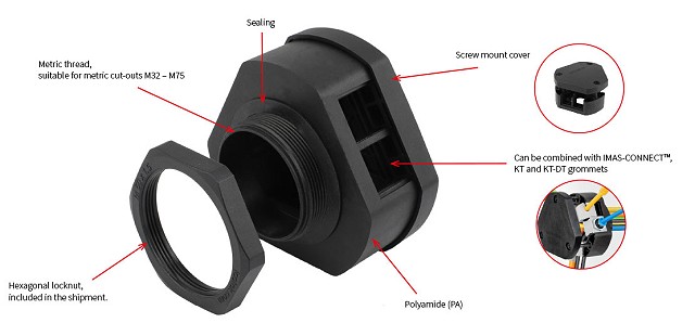 When using multi grommets, up to 48 cables can be routed and a high cable density is achieved. Thanks to the screw mount cover and the use of split cable grommets, retrofits, repairs and maintenance can be done much more easily and quickly.
