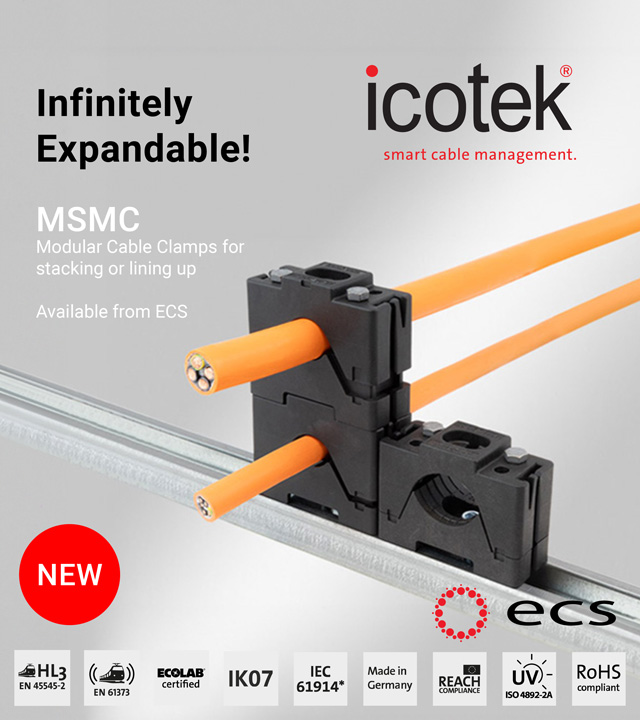 The Modular Stackable Cable Clamp (MSMC) by icotek is used for easy, quick and secure fastening of cables, pipes and other cylindrical components. The variable clamping range is up to 16 mm.